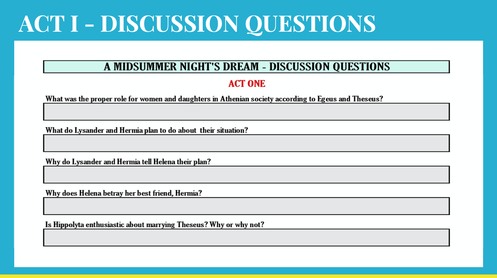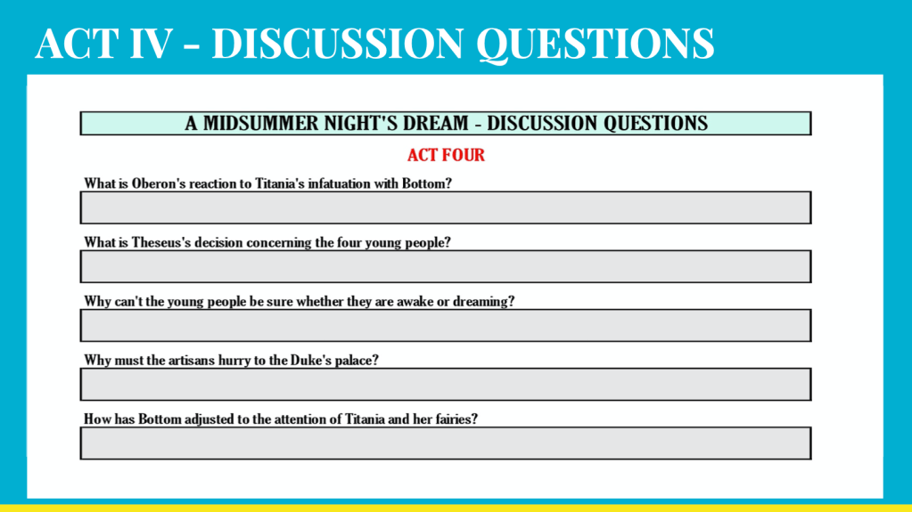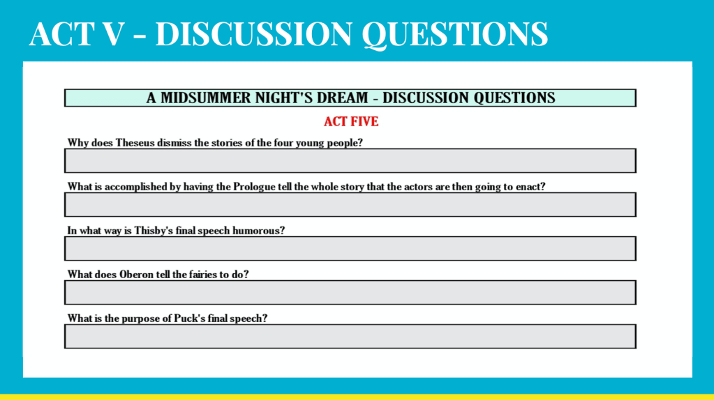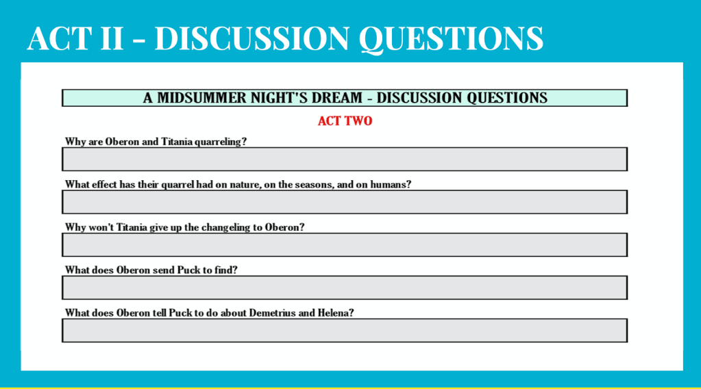 - In-class reading of Shakespeare’s, A Midsummer Night’s Dream, Acts I & II